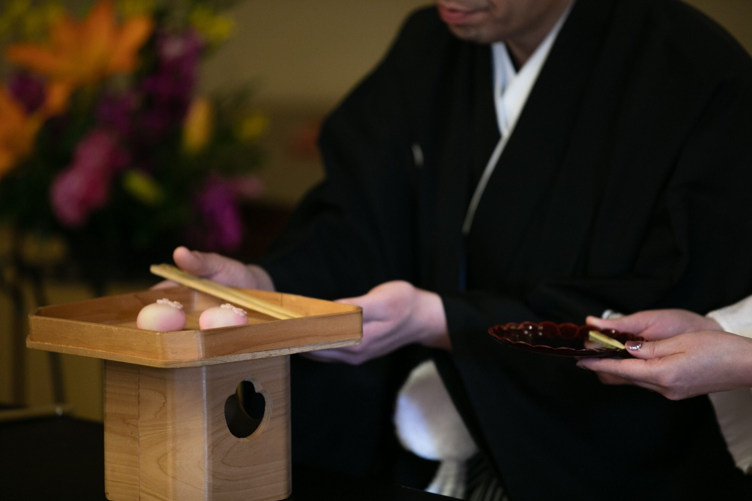 新郎新婦が箸を使い、盛付けられた主菓子をお皿に取分けてゲストに振る舞う「箸取りの儀」は、ウェディングケーキのファーストバイトから着想を得たもの。