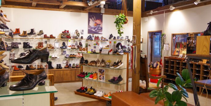 店内に足を踏み入れると、木の温もりを感じる広々とした空間に、丁寧に陳列された靴が並びます。