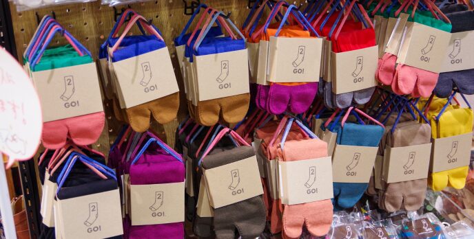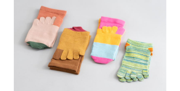 温泉後のリラックスタイムには、血行促進を助ける「GO!」のオリジナル5本指ソックス。デザインも豊富で見た目も楽しい。